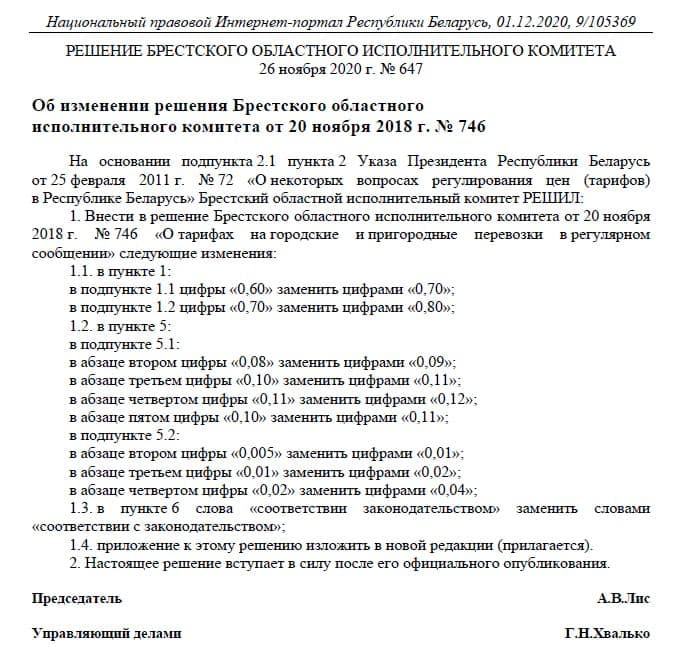 А 1 декабря на Национальном правовом Интернет-портале Республики Беларусь опубликовано решение Брестского облисполкома о повышении стоимости проезда. Один талончик на автобус и троллейбус теперь стоит 70 копеек, проездной на месяц на автобус или троллейбус — 31,5 рубля, на оба вида транспорта — за 42,04.