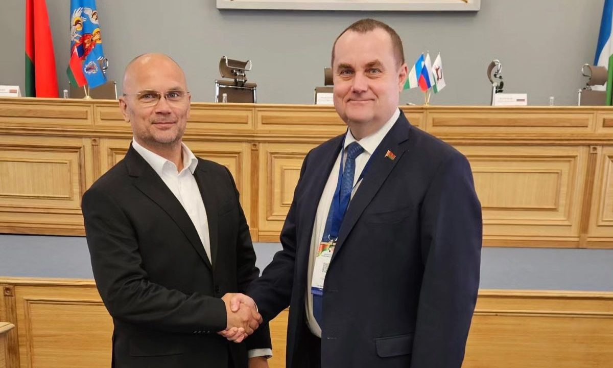 Яраслаў Грабяншчыкоў (з правага боку) на форуме «Мінск і Уфа» пасля перамоваў з уфімскімі прадпрыемствамі. Крыніца фота: scs.by