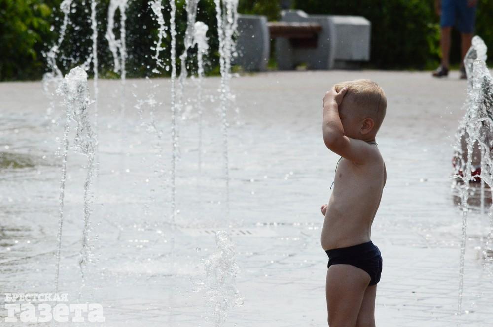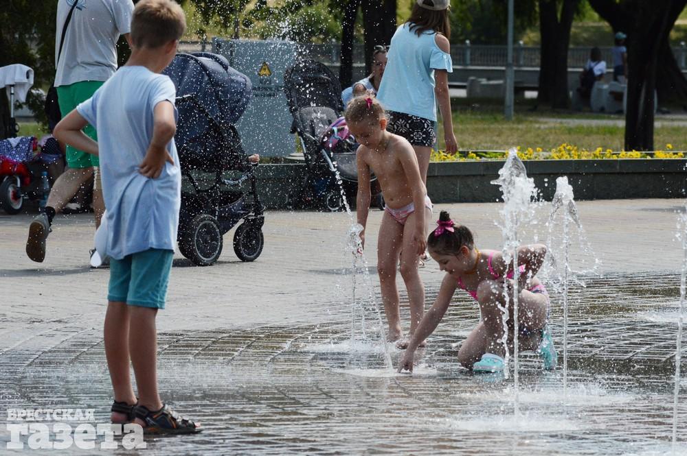 Многие резвятся в фонтане на набережной: кто в одежде, кто в купальниках и плавках, а самые маленькие — и голышом.