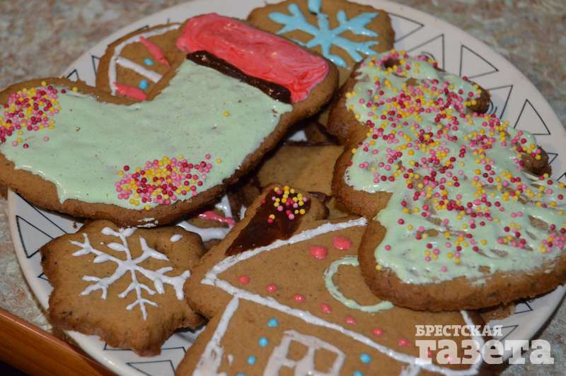 Надо: для теста: 1,5 ст. муки, 1 ч. л. соды, гашенной уксусом, 2 ч. л. тертого свежего имбиря, 1 ч. л. корицы, 1 ч. л. кардамона, 1 щепотка молотой гвоздики, 100 г сливочного масла, 150 г сахара, 1 яйцо; белая глазурь: 1 яичный белок, 1 ст. л. лимонного сока, 0,5 ст. сахарной пудры; шоколадная глазурь: шоколад, молоко; пищевые красители, украшения для выпечки.