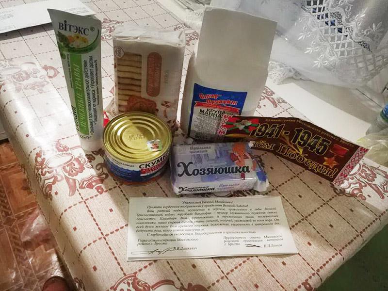 Евгений Михайлович Бурдейко каждый год ждет поздравления на 9 Мая. «Ему важен сам факт того, что его помнят», — рассказал «БГ» его внук Владимир Кривченя. Именно он опубликовал в социальной сети Facebook фотографию подарка, который в канун праздника получил брестский ветеран. В комплект пошли зубная паста, печенье, пачка манной крупы, банка скумбрии и кусок мыла. К подарку прилагалось поздравление, подписанное главой администрации Московского района города Бреста Вячеславом Дашкевичем и председателем совета Московской районной организации ветеранов города Бреста Николаем Леоновым.