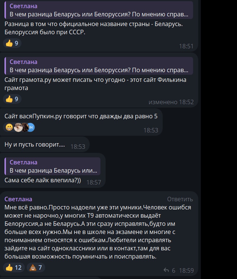 «Не умничать» — частая просьба россиян в конфликтах с беларусами. Еще один пример (ответы беларусов выделены жирным начертанием):