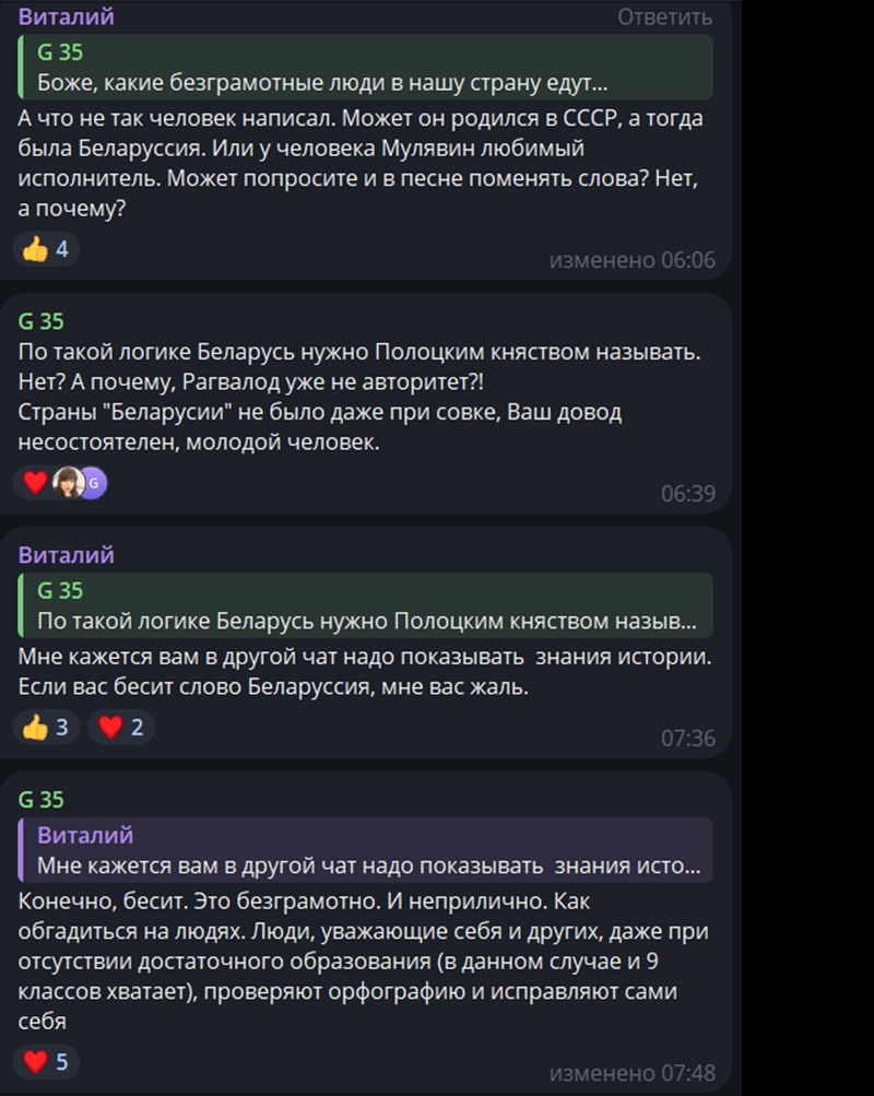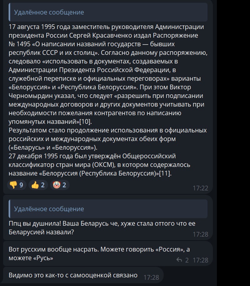 «Мне кажется вам в другой чат надо показывать  знания истории. Если вас бесит слово Беларуссия, мне вас жаль».