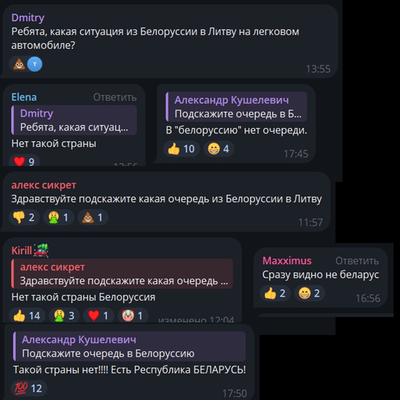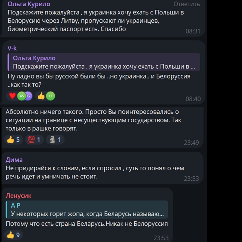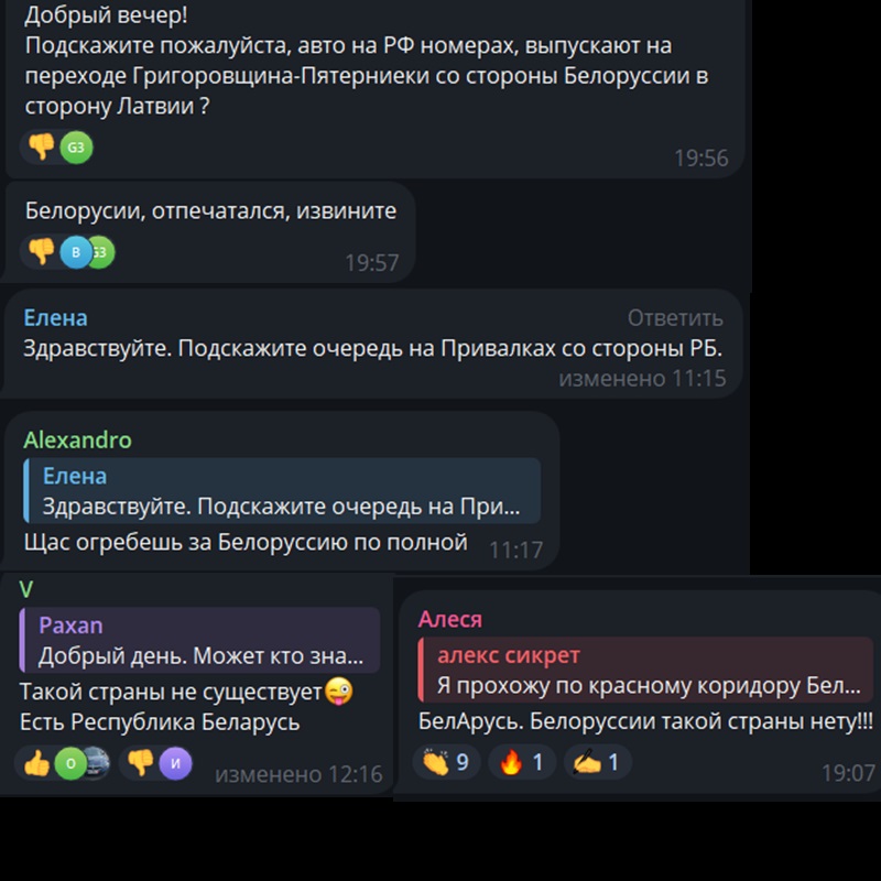 Конфликт в приграничном чате между беларусами и россиянами. По реакциям на сообщения можно понять, кого поддерживают участники чата