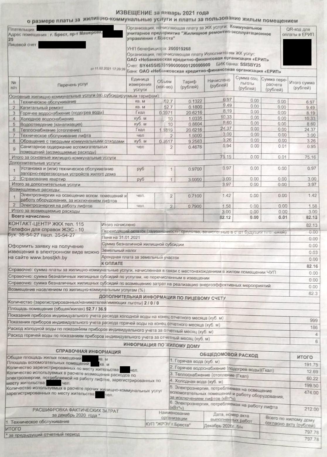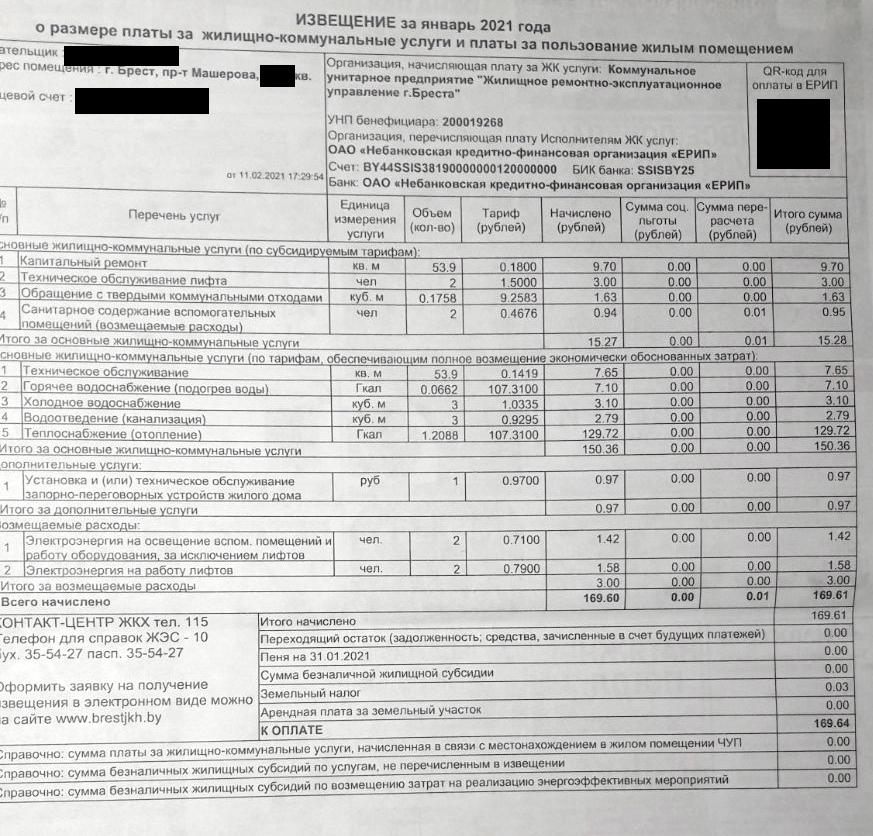 Чиновники планировали, что в 2020 году население будет возмещать 83,2% затрат на оказание ЖКУ. Этот показатель значился на жировках. Он есть и на фотографиях, которые прислали «БГ» наши читатели. На январских жировках видно, что в графе «возмещение населением по ЖКУ» стоит уже другая цифра — 82,3%. Получается, что планируемый уровень возмещения населением затрат на оказание ЖКУ на этот год ниже, чем на 2020-й, несмотря на повышение тарифов в пределах 5 долларов.
