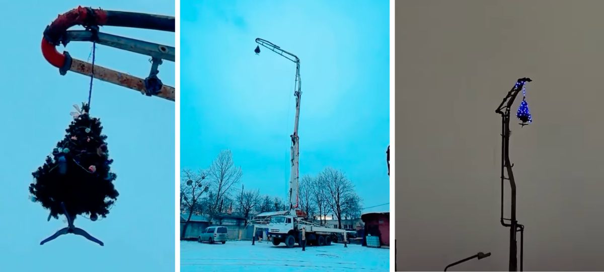 В областном центре нашли самую необычную новогоднюю елку: ее не поставили, а подвесили на высоте 32 метра — прямо на стреле бетононасоса.